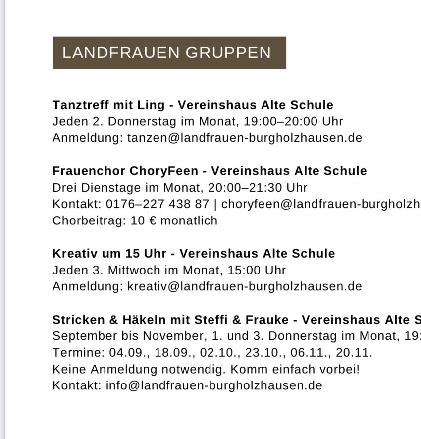 Wir arbeiten ehrenamtlich in unserer Freizeit und engagieren uns gerne für die Frauen in Burgholzhausen und Umgebung. Sprechen Sie uns einfach an. Wir freuen uns über Zuspruch, Hinweise und natürlich: interessierte Frauen. Denn LandFrauen-Sein ist schon lange weit mehr als Kuchenbacken.