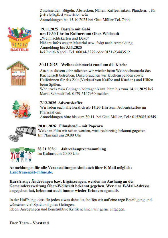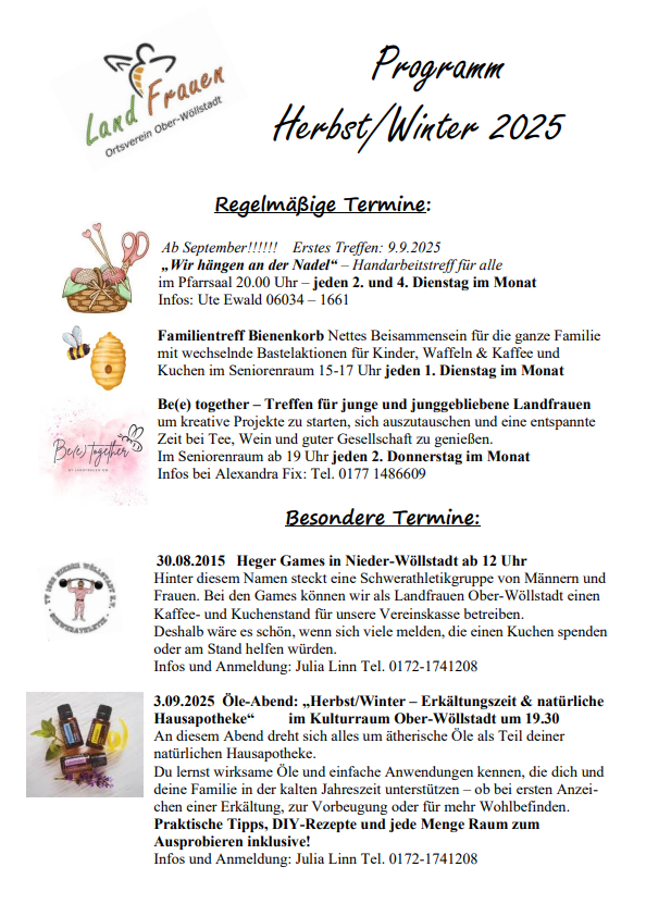 Im Anschluss an den Gottesdienst verwöhnten die Landfrauen im herbstlich geschmückten Pfarrsaal die Gäste mit einem deftigen Mittagessen, zu dem Jung und Alt herzlich eingeladen waren. Selbstverständlich gab es danach auch wieder eine reich gedeckte Kuchentheke mit Kunstwerken aus den Küchen der Landfrauen. Bei Kaffee und Kuchen bot sich eine gute Gelegenheit gemütlich beieinander zu sitzen und miteinander in Austausch zu kommen. Besonders berührend war der Abschluss des Festes: Die Erntedankgaben wurden direkt am Folgetag aus der Kirche zur Friedberger Tafel gebracht, um zu zeigen, dass Dank auch bedeutet, an andere zu denken und Bedürftigen zu helfen. Die Landfrauen Ober-Wöllstadt danken allen Helferinnen und Helfern sowie den Gästen für ihr Engagement und die gute Stimmung.